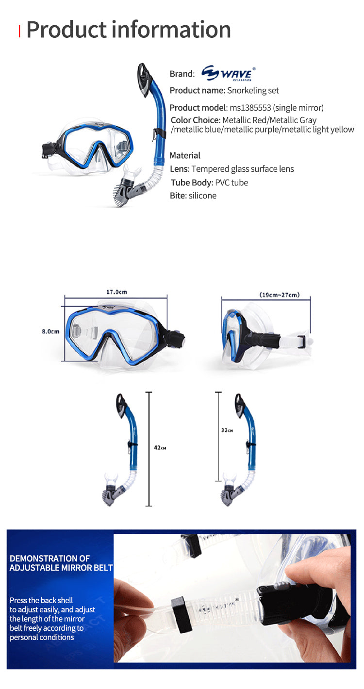 Wave Scuba Snorkeling Fins Free Diving Mask Combo Set Metallic Blue Dry Top Snorkel